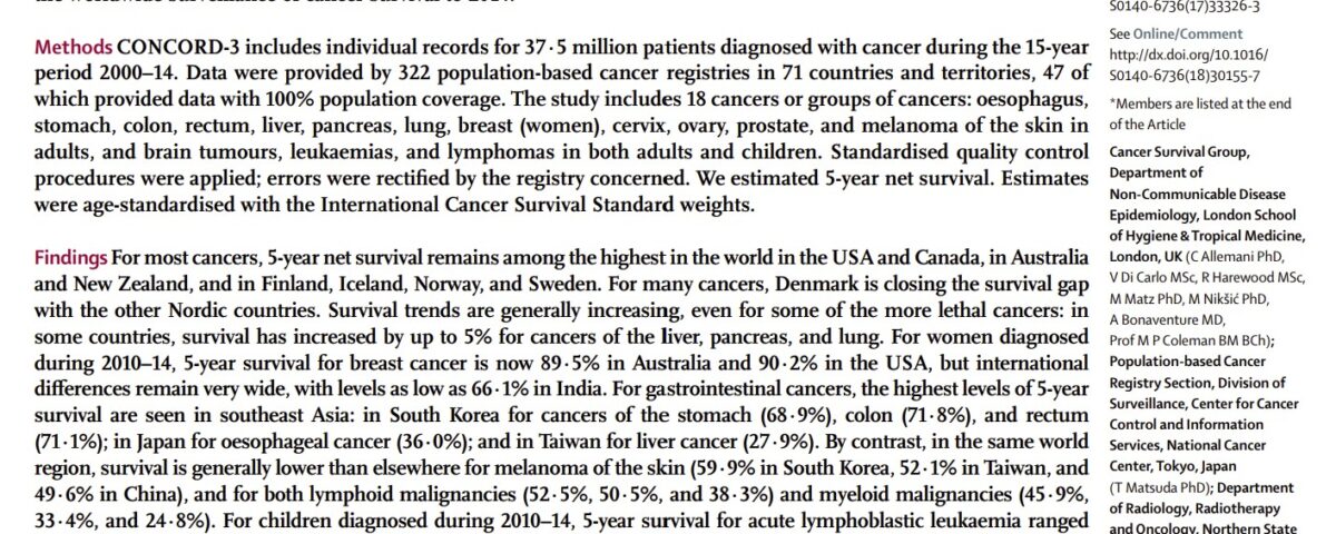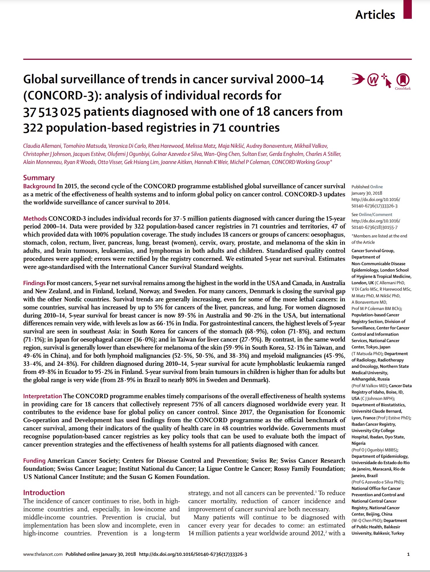 Claudia Allemani, Tomohiro Matsuda, Veronica Di Carlo, Rhea Harewood, Melissa Matz, Maja Nikšić, Audrey Bonaventure, Mikhail Valkov, Christopher J Johnson, Jacques Estève, Olufemi J Ogunbiyi, Gulnar Azevedo e Silva, Wan-Qing Chen, Sultan Eser, Gerda Engholm, Charles A Stiller, Alain Monnereau, Ryan R Woods, Otto Visser, Gek Hsiang Lim, Joanne Aitken, Hannah K Weir, Michel P Coleman, CONCORD Working Group