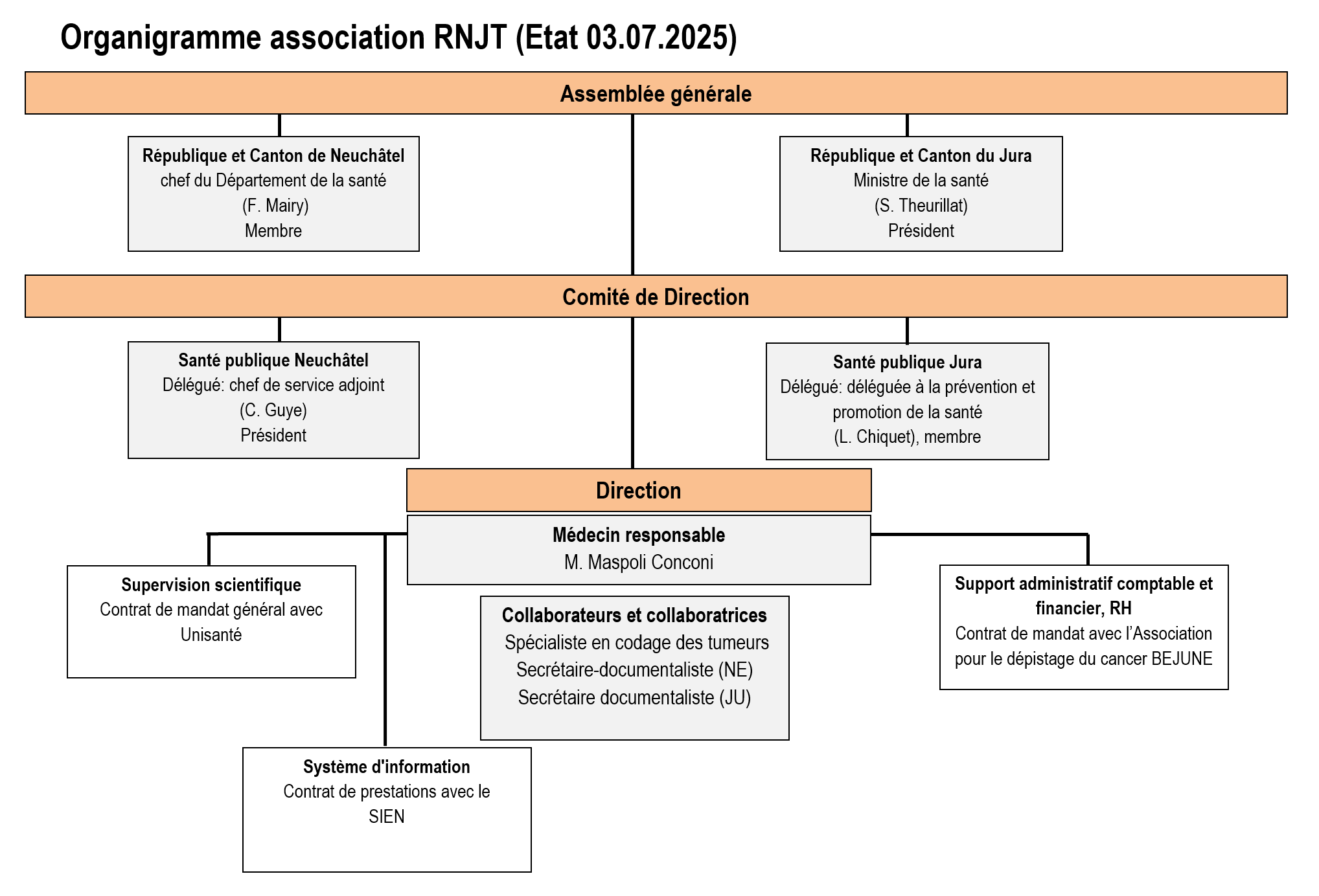 Le chef de service adjoint du Service de la santé publique de canton de Neuchâtel, M. Christophe Guye, est le repré­sentant neuchâ­telois au Comité de direction et en est le président. Mme Laure Chiquet, colla­bo­ra­trice scien­ti­fique au Service de la santé publique du canton du Jura, en est la repré­sen­tante jurassienne.