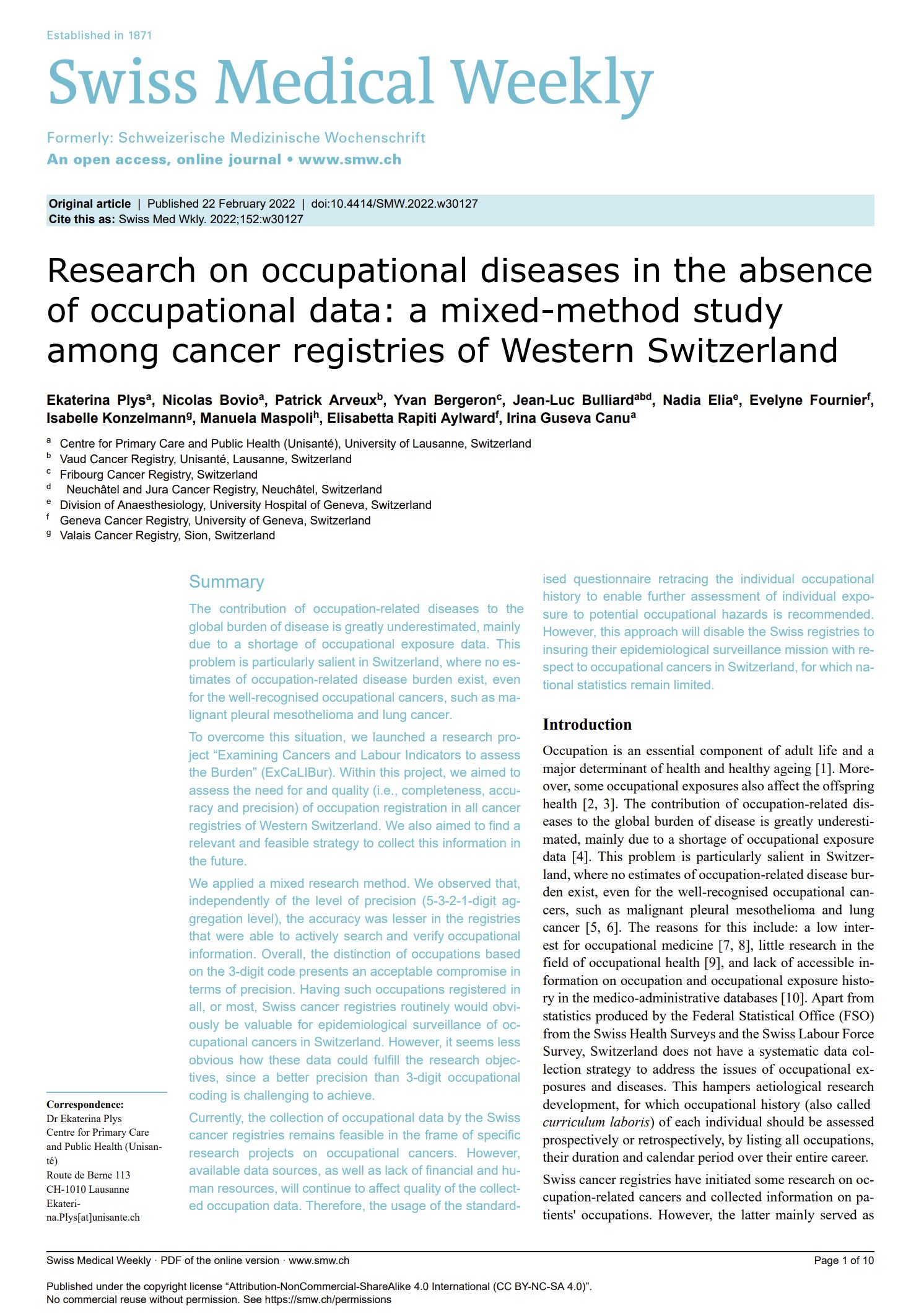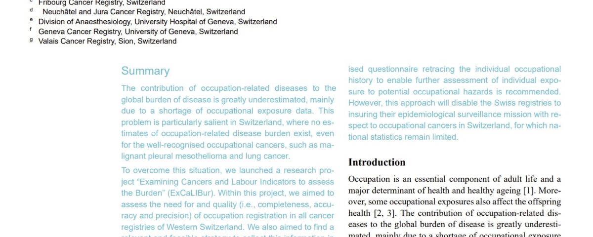 Plys E, Bovio N, Arveux P, Bergeron Y, Bulliard J‑L, Elia N, Fournier E, Konzelmann, Maspoli M, Rapiti Aylward E, Guseva Canu I. Research on occupa­tional diseases in the absence of occupa­tional data: a mixed-method study among cancer regis­tries of western Switzerland. Swiss Med Wkly 2022; 152:w30127.