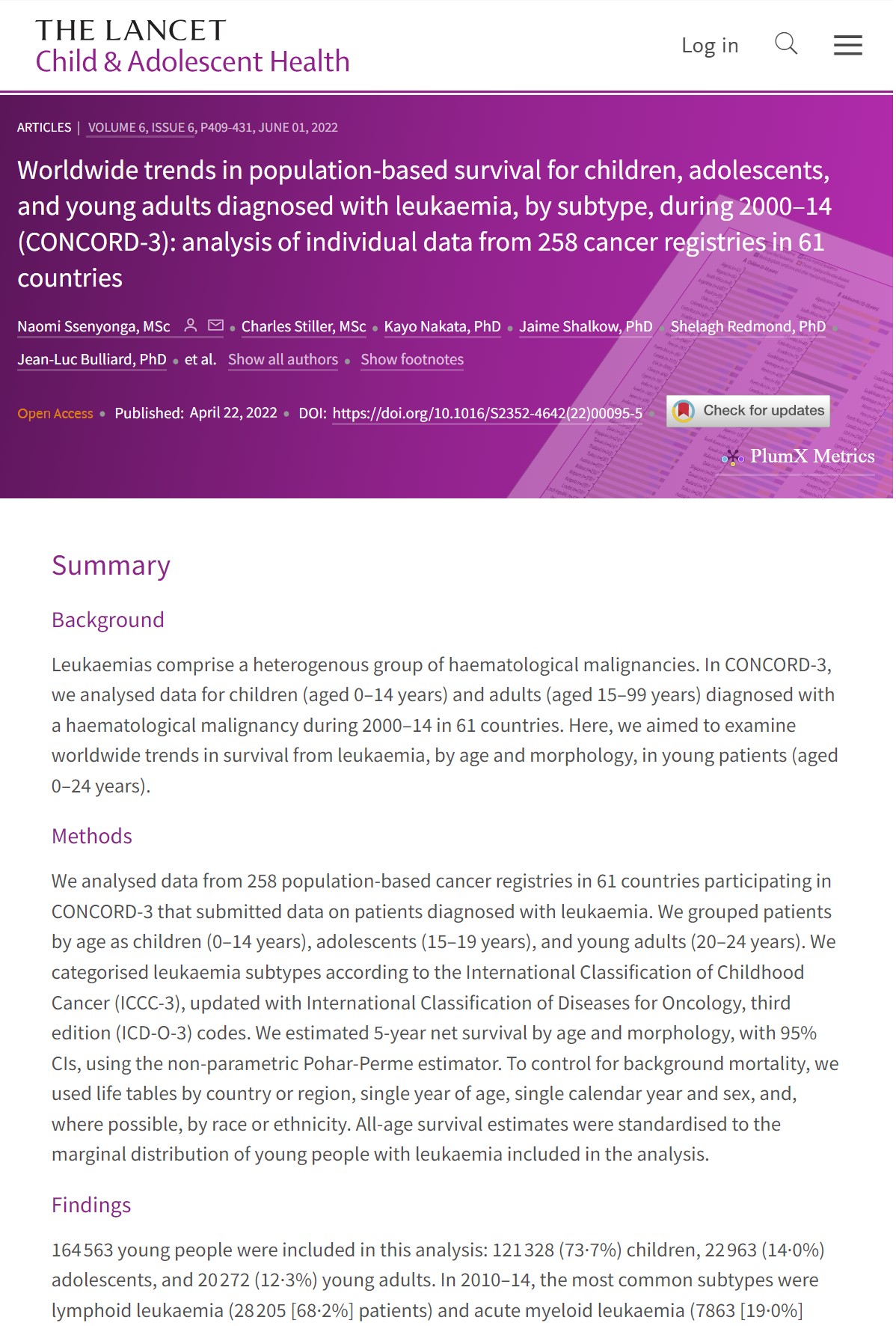 Naomi Ssenyonga, Charles Stiller, Kayo Nakata, Jaime Shalkow, Shelagh Redmond, Jean-Luc Bulliard, Fabio Girardi, Christine Fowler, Rafael Marcos-Gragera, Audrey Bonaventure, Nathalie Saint-Jacques, Pamela Minicozzi, Prithwish De, Miguel Rodríguez-Barranco, Siri Larønningen, Veronica Di Carlo, Margit Mägi, Mikhail Valkov, Karri Seppä, Dyfed Wyn Huws, Michel P Coleman, Claudia Allemani, on behalf of the CONCORD Working Group, Worldwide trends in population-based survival for children, adolescents and young adults diagnosed with leukaemia, by sub-type, during 2000–14 (CONCORD‑3): analysis of individual data from 258 cancer registries in 61 countries, The Lancet Child & Adolescent Health, 22 April 2022.